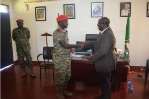 Military Police’s Brigadier Sabiiti, receives laptops from NITA-U’s James Saaka