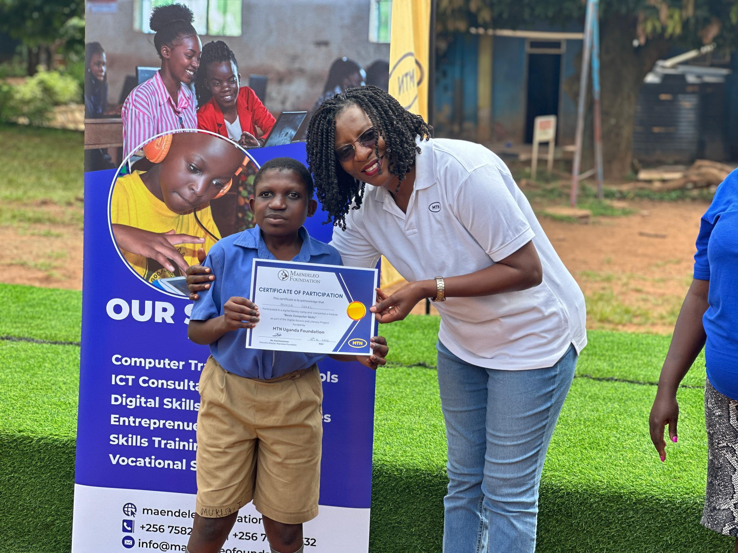 The General Manager for wholesale and carrier services at MTN Uganda Ms. Juliet Nsubuga awards a certificate to one of the pupils at Uganda School for the Deaf who went through ICT training by MTN Uganda CSR arm, MTN Foundation.