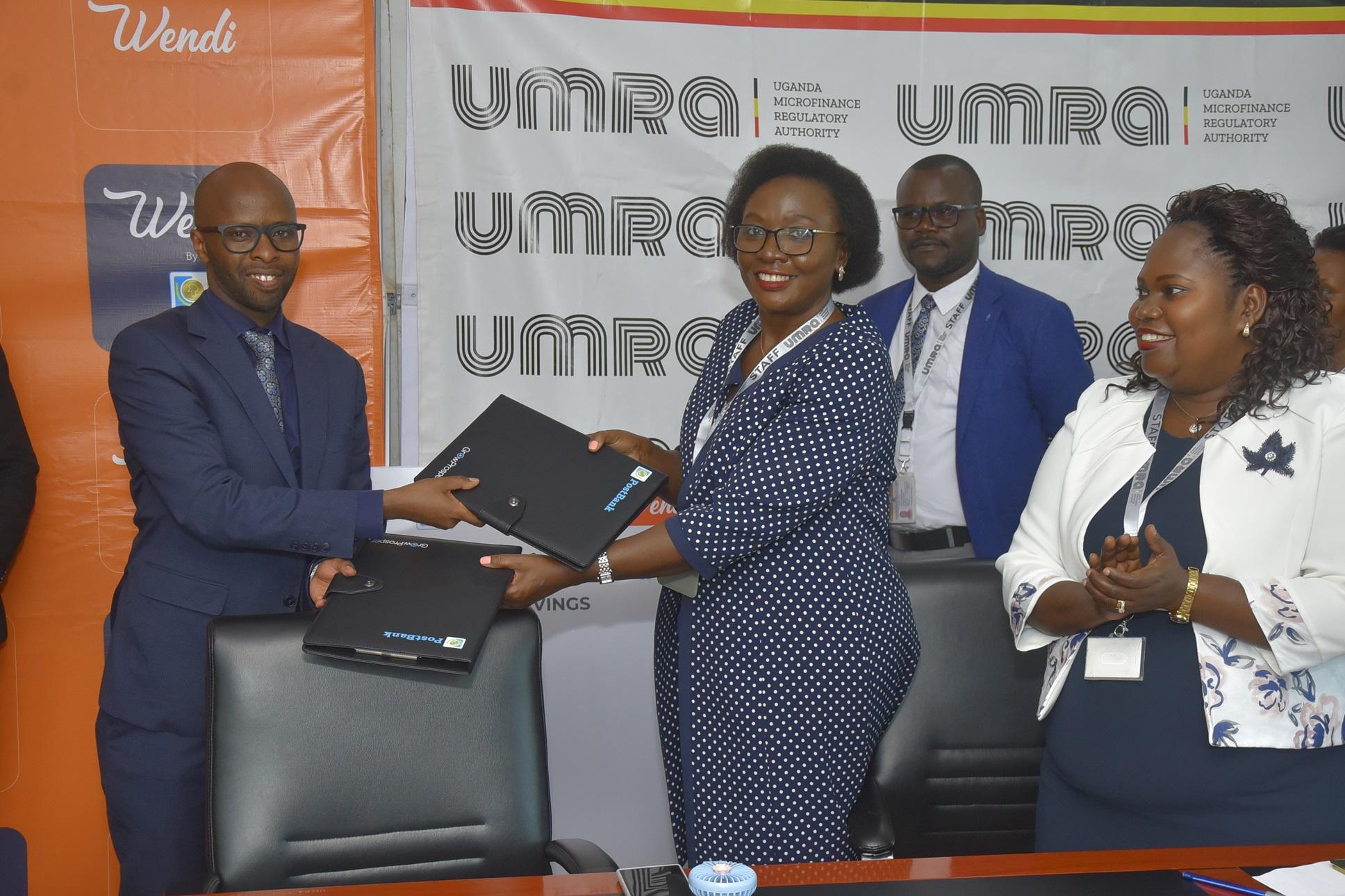 Andrew Kabeera (left); PostBank Uganda Executive Director and Edith Tusuubira (right); Executive Director of UMRA exchange MoUs that initiate a collaboration aimed at digitizing the operations of tier IV Microfinance Institutions. Courtesy Photo