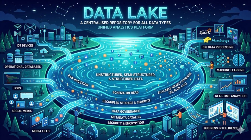 A data lake is more than a storage repository. It is a centralized environment designed to store raw data in its native format, whether structured, semi-structured, or unstructured. This flexibility is particularly valuable for AI initiatives, where models often need access to diverse datasets such as logs, images, text, sensor data, and transactional records.