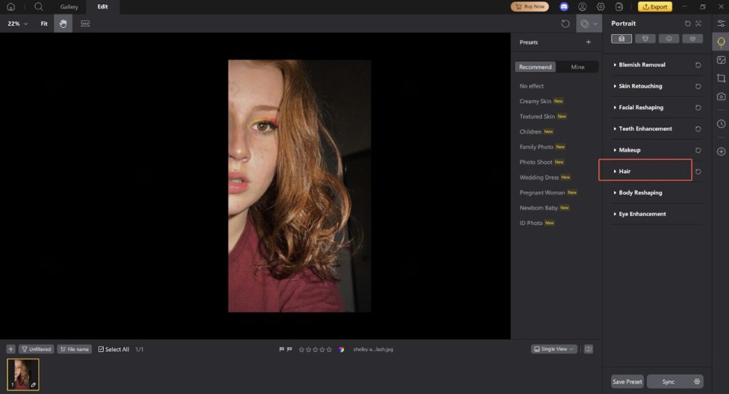 Apply AI enhancement tools. Adjust face, skin, and hair details