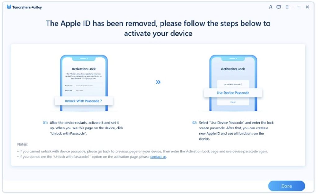 4. Now, your iPhone has been successfully removed form Find My/Apple ID. You can restore and activate your iPhone while Unlock with Passcode.