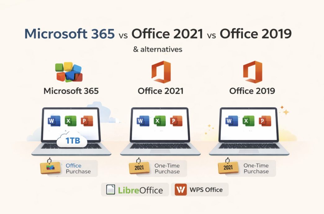 Microsoft 365 covers five devices under one subscription, and you can swap between them. Office 2019 and 2021 are both tied to a single machine. Get a new laptop or work across two computers, and you are paying for a second license. With 365, you sign in, and you are covered.